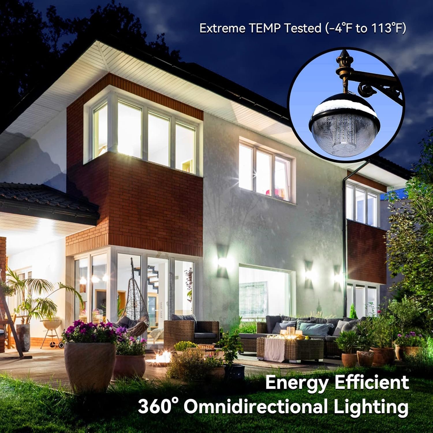 60W power consumption replaces traditional 500W incandescent bulbs. - 360° Omnidirectional Lighting:
